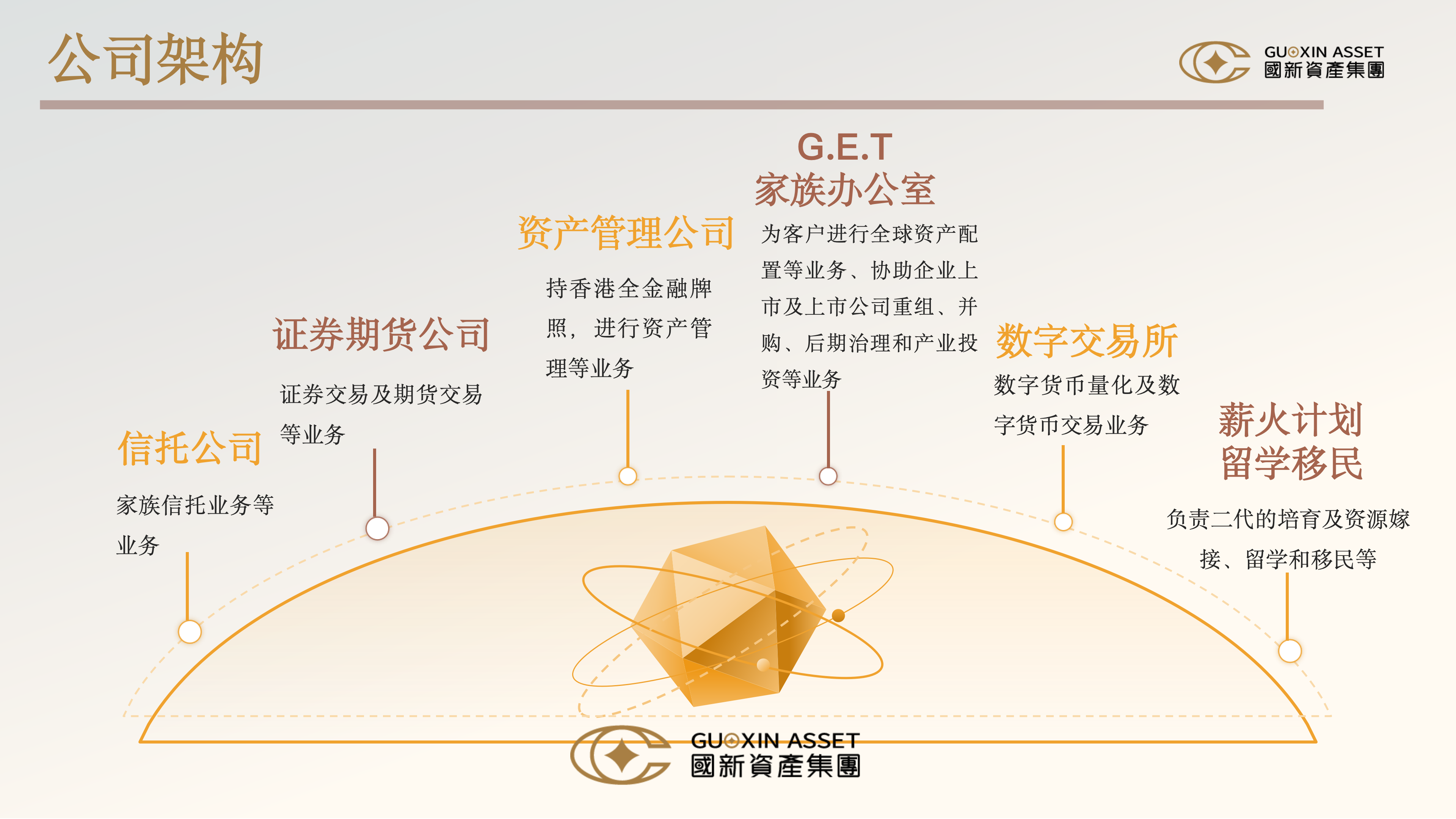 國新資產集團是一家總部位於香港的全球化綜合金融服務機構,業務分佈全球,在紐約、杜拜、中國台灣地區、新加坡及東南亞國家、中國深圳、上海、廣州、武漢、長沙、西安等地區都設立分公司。國新資產集團持有證券及期貨事務監察委員會 (SFC) 的牌照,即在證監會監管下可進行第 4 類(就證券提供意見)和第 9 類(資產管理)的受規管活動牌照,持有香港金融全牌照1、4、6、9 號牌照、信託牌照、數字交易平台以及移民牌照。國新資產集團憑藉香港金融牌照優勢(涵蓋證券、期貨、資管、諮詢及信託服務),為客戶提供一站式綜合金融解決方案。依托合規架構與全球網絡資源,專注於為高淨值家族及企業提供全球資產多元化配置、財富安全避險與跨境併購整合等專業服務。